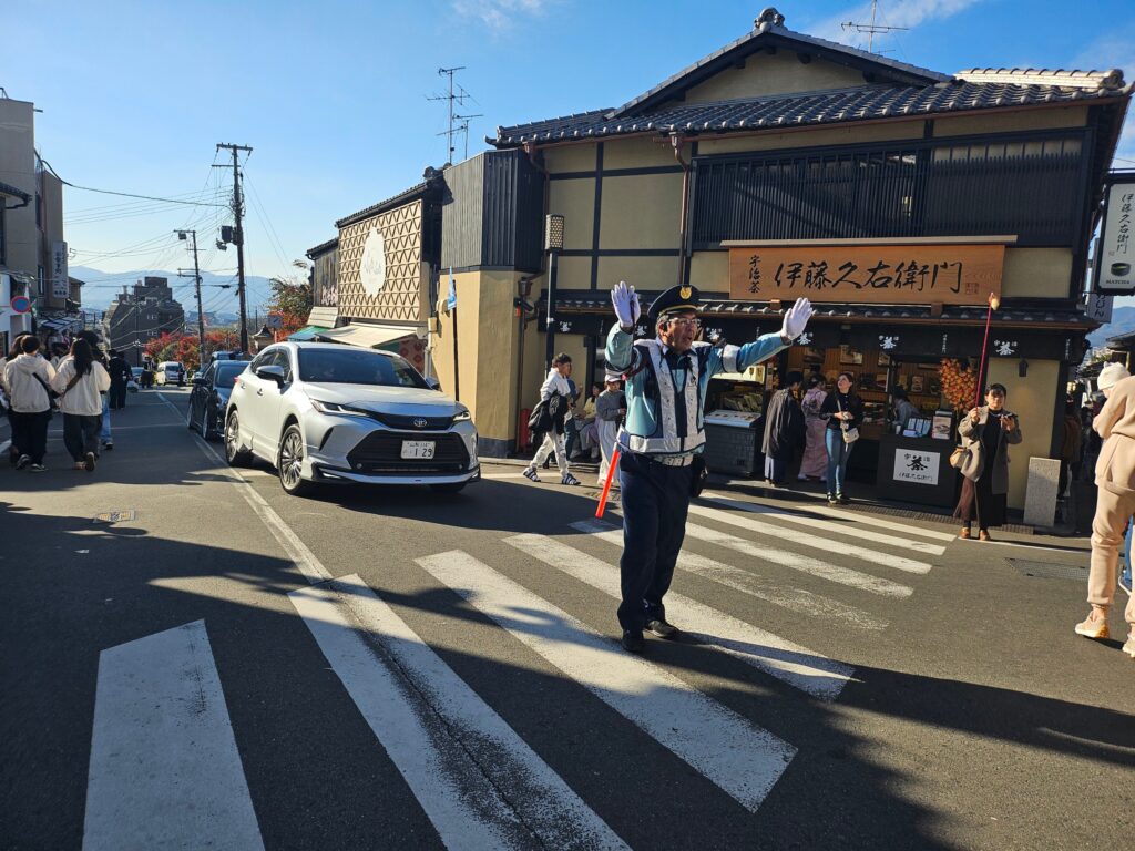 東山五条周辺、東福寺周辺での交通対策の他、観光地へ続く道での事故の防止、案内等、警察と複数の警備会社で協力し、警備に当たりました。