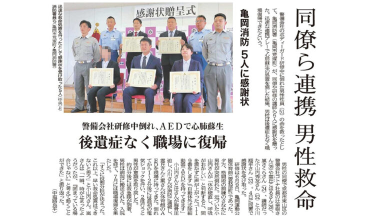 警備会社のボディーガード研修中に倒れた警備隊員の命を救ったとして、亀岡消防署が同僚や研修講師ら5人に感謝状が贈られました。